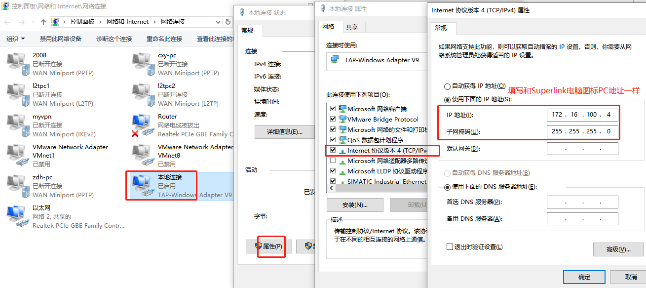 远程网关插卡后,4G拨号联网都正常,但是电脑端登录Superlink工具后显示网关侧不断不在线,无法远程访问用户设备,如下图: 此时请检查一下电脑端TAP虚拟网卡,其IP地址是否异常切换为dhcp自动获取地址模式(地址为169.254.X.X的无效地址),如果是这种情况设置一下TAP虚拟网卡为静态地址,IP地址填写和Superlink工具上面PC电脑下面地址一致即可。 虚拟TAP网卡地址信息查看及修改成功后设备在线正常,分别如下图: